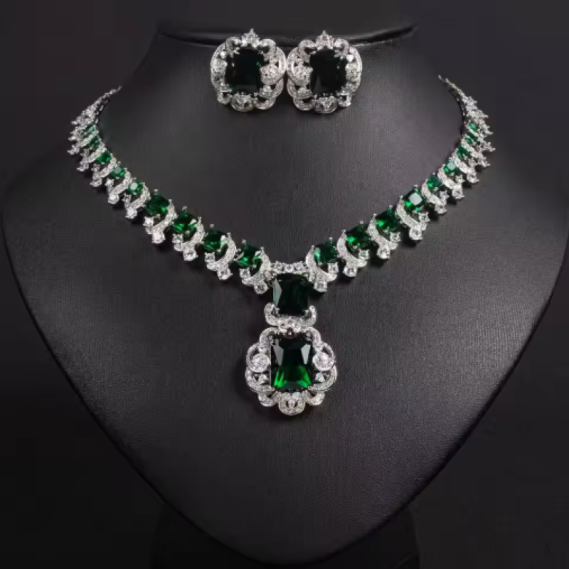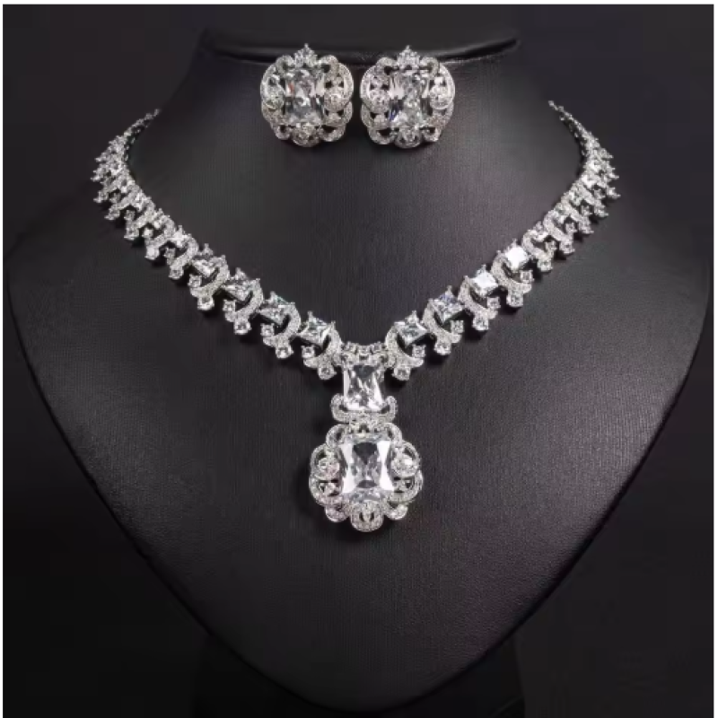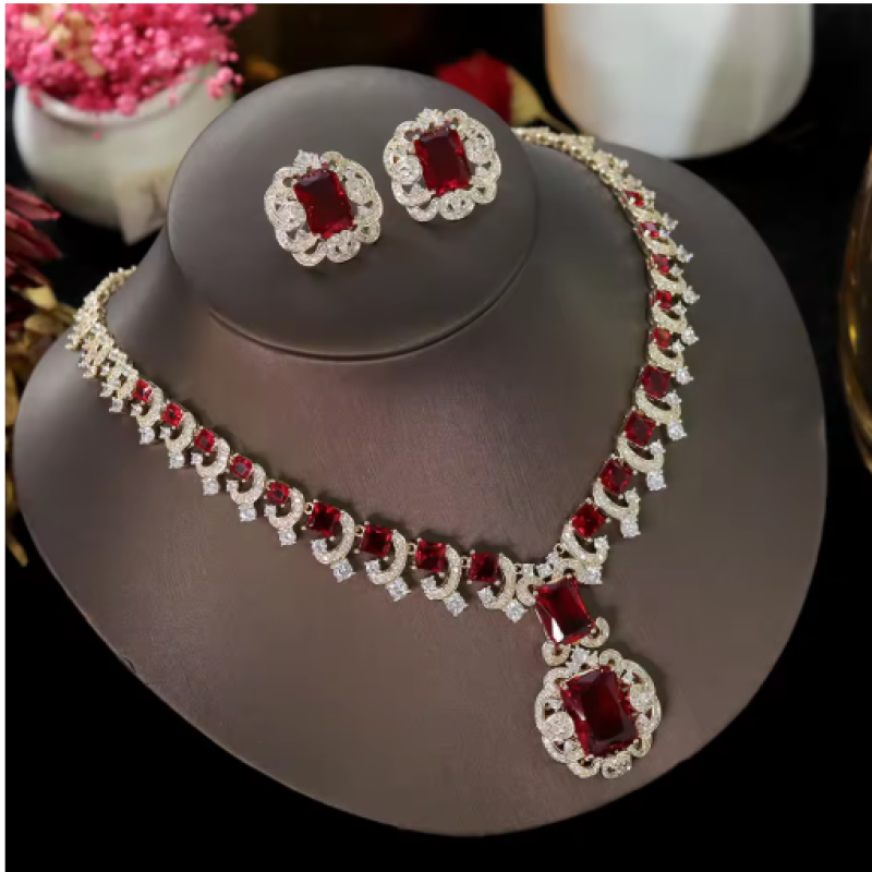 ASNORA New European and American Banquet Jewelry, Heart Earrings Necklace Set Women's Red Zircon Square Pendant