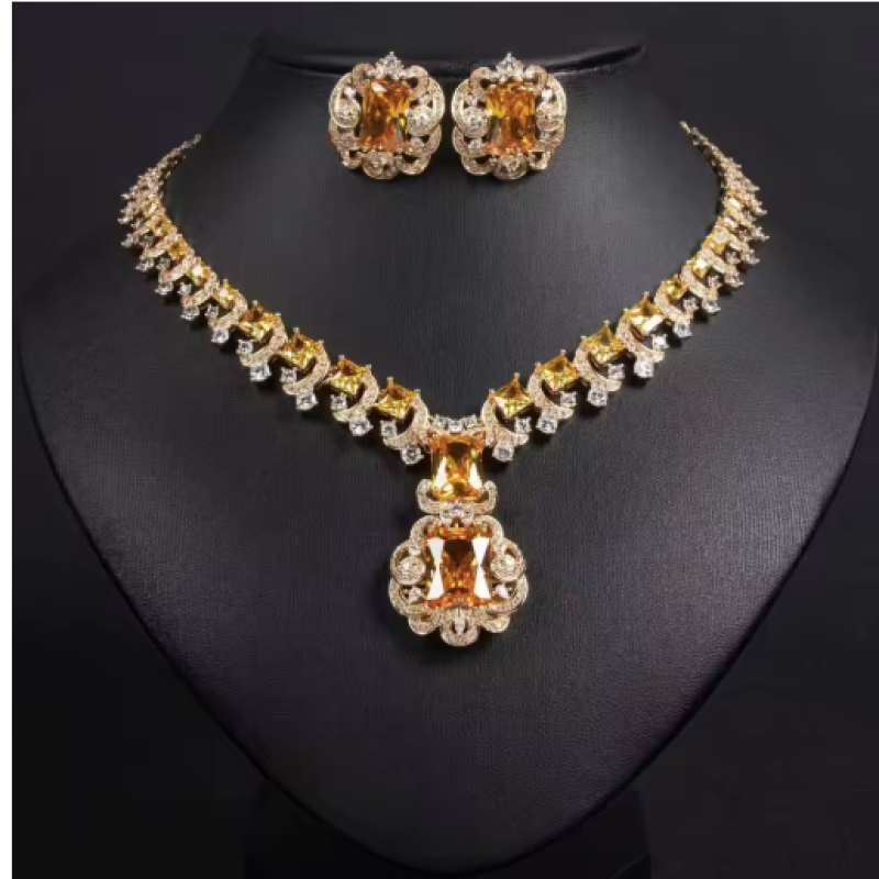 ASNORA New European and American Banquet Jewelry, Heart Earrings Necklace Set Women's Red Zircon Square Pendant